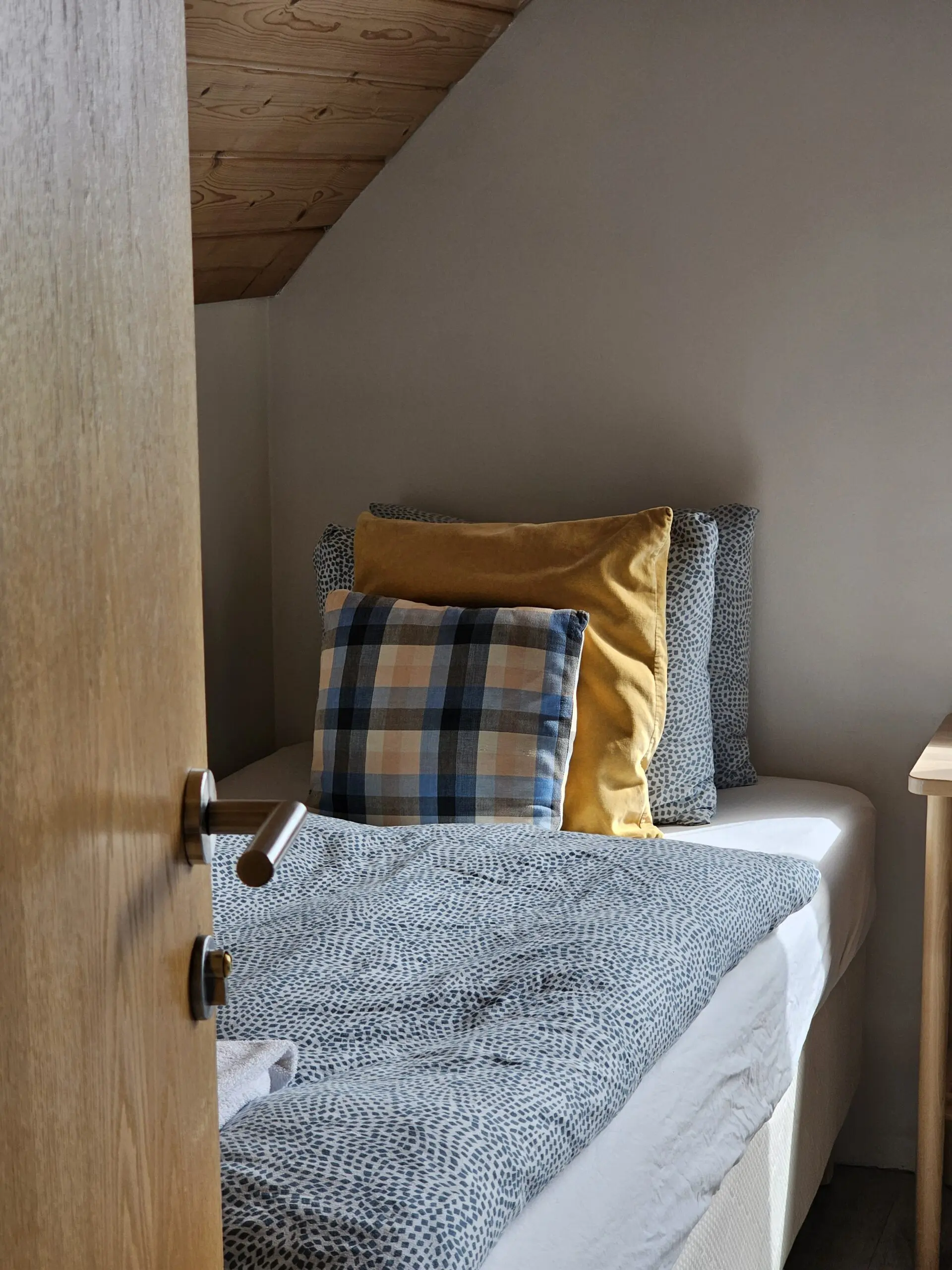 Small & budget room with a DBL bed size of 160×200. Wash basin in room and access to shared bathroom facilities. Comfortable beds with linen and towels included in the room price.