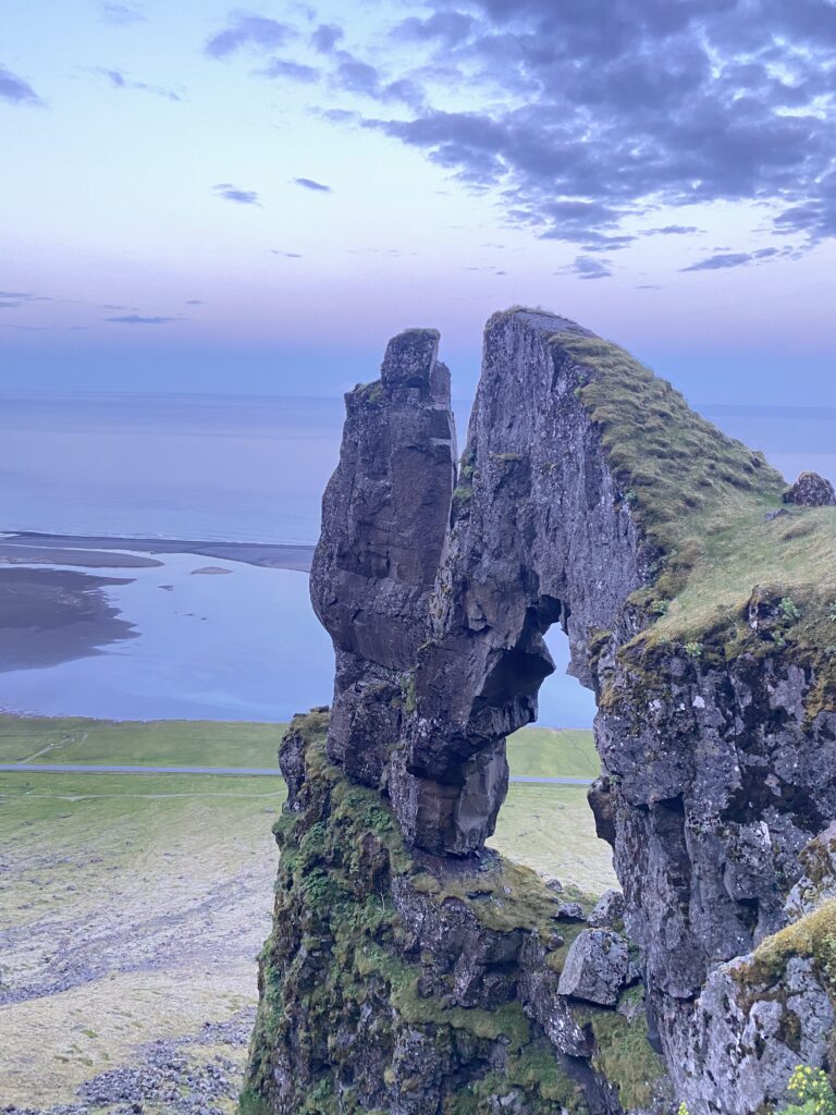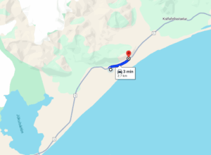 Sléttaleiti, or the writer’s house is roughly 2.7 km away from Skyrhúsið, which is a short drive or hike along highway 1. If you decide to drive, we recommend parking at the base of the road (closest to the highway) from the path that leads up to the house. From there, you will hike directly up the mountain, where you can see the slightly hidden arch from the road.